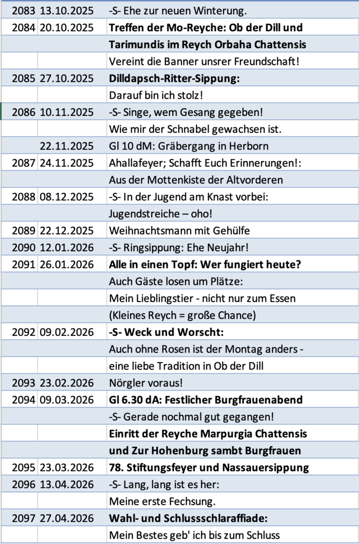 Zu jeder Sippung tragen wir Rittermantel, zu * Festgewams, volle Rüstung und / oder Bandelier!